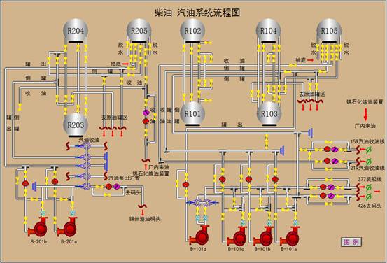 用棒圖和數(shù)據(jù)表顯示所有有品的即時(shí)存量和空容量,體積、質(zhì)量。物料存儲(chǔ)狀況的直觀圖形顯示,并通過(guò)不同的顏色反映現(xiàn)場(chǎng)生產(chǎn)動(dòng)態(tài),設(shè)備工作狀態(tài)等。油品計(jì)量管理與控制